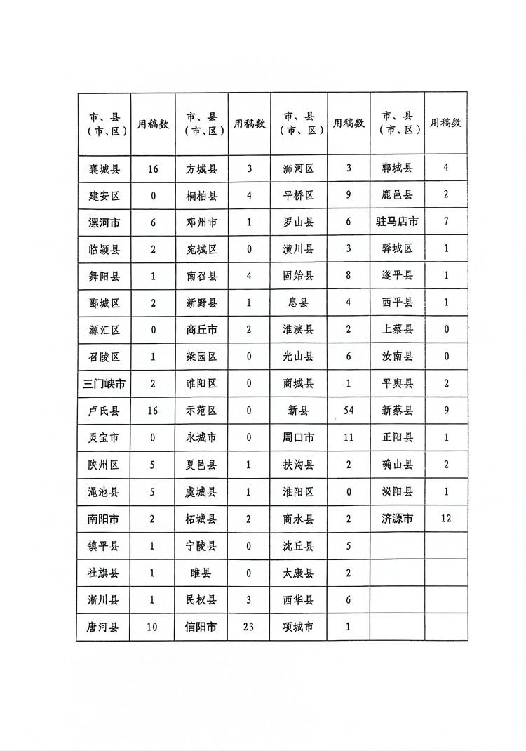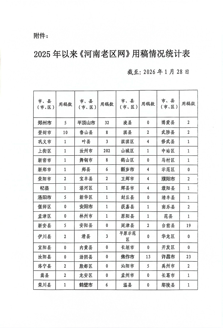 《河南老区网》是省老促会向社会开展老区宣传的平台,是全省老促会系统进行工作交流的平台,是全省老促会系统的工作资料库。网站开通以来,各地老促会积极投稿,促进网站在扩大老区宣传、推动工作交流等方面日益发挥较好的作用。按照省老促会领导的要求,现将2025年以来网站的用稿情况予以通报,希望各地老促会共同关注《河南老区网》,更加主动地投稿,不断扩大老区宣传,推动革命老区建设。