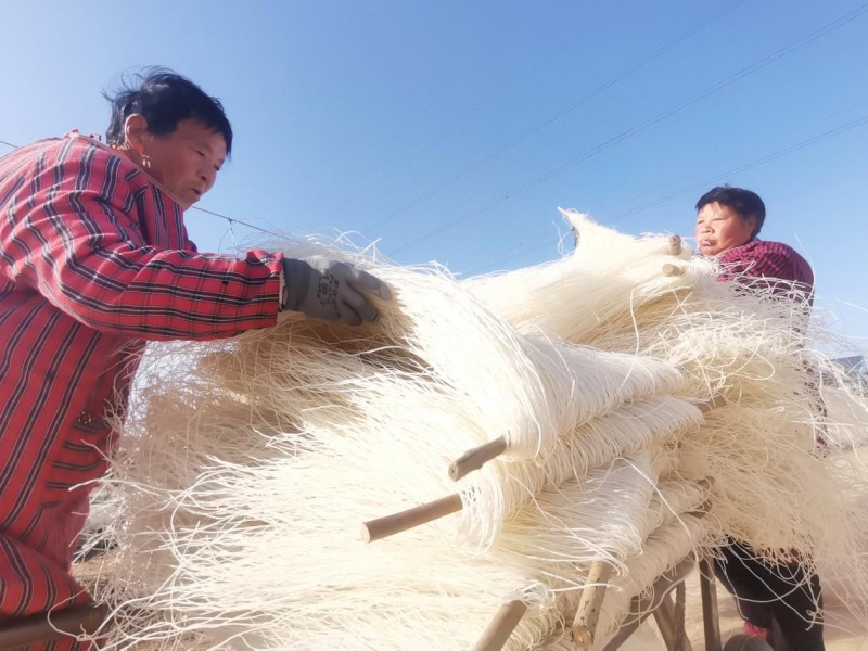 李杰的粉条事业一头连着田间地头,一头连着乡村振兴。每到冬季,60多岁毛胡庄村村民赵秀玲都会与其他村民一起,来到“粉条小院”工作。粉条生产流程她早已熟记在心,需要做的就是将生产的粉条及时晾晒。20米见方的小院内,她一天至少要走上2万多步,生活的充实也给她带来满意的的收入。
