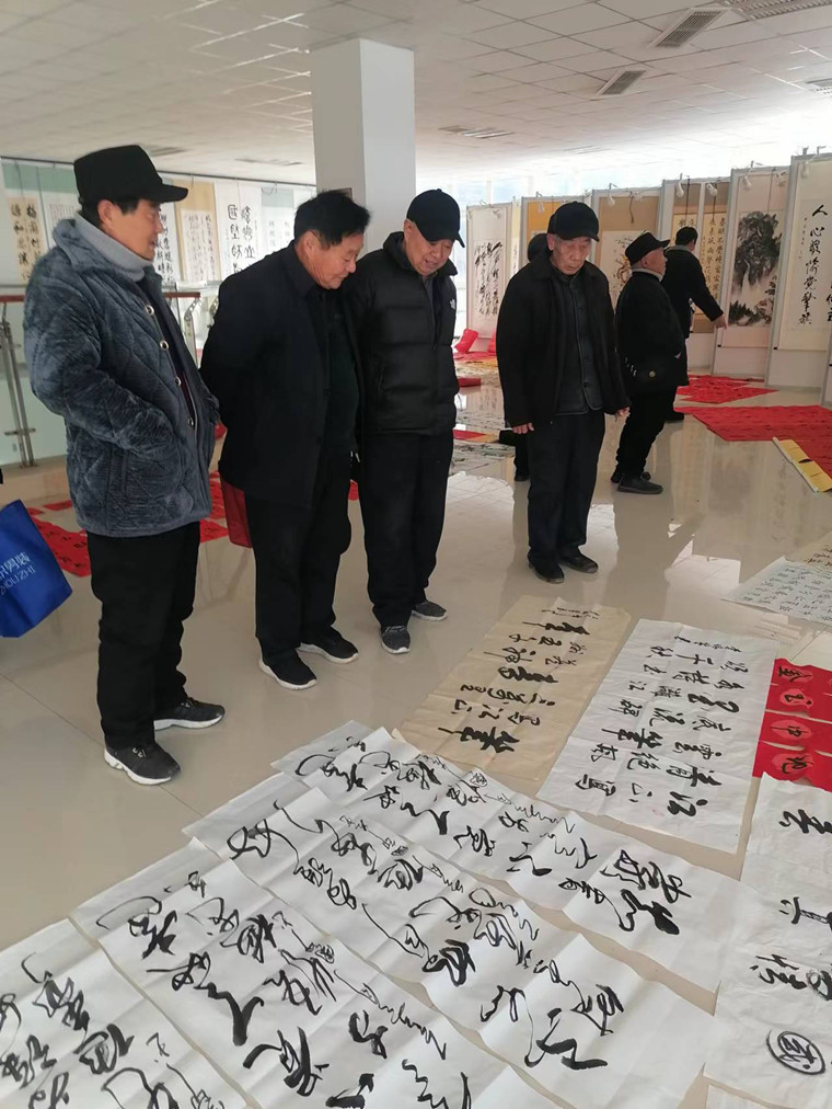 这次展出参加人员多,作品展出量大,展出作品有楷书、有行书、有草书、有篆书等。形式有长卷、有斗方、有条幅,更多的是大红纸书写春联。大家用书画艺术。歌颂党、歌颂祖国、歌颂全国各族人民在党的领导下团结奋斗所取得的辉煌成就。许多老同志。不顾年大体弱,天寒地冻,精心创作,拿出自己的最优作品。参展会员中年龄最大的88岁,有着40年教龄的退休老教师窦全赠积极参加,她的隶书线条优美,飘逸大方,受到大家好评。