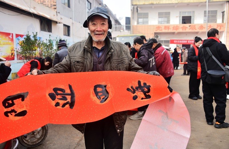 在春联义写区前,书法家们凝神聚气、挥毫泼墨,笔尖流转间,一副副寓意吉祥的春联、一个个苍劲有力的“福”字跃然纸上。“春回大地千山秀,福降人间万户欢”“国泰民安逢盛世,风调雨顺颂华年”,既有辞旧迎新的美好期许,也有对乡村振兴的深情祝愿。村民们拿着刚写好的春联细细端详,脸上满是喜悦。驻村队员主动帮忙晾晒、整理春联,确保每一副都完好送到村民手中,让笔墨间的暖意传递到千家万户。