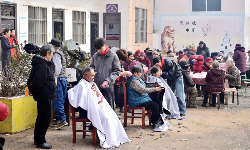 在爱心剪发区前,汝州市青年联合会的志愿者们手法娴熟、耐心细致,一边为村民修剪头发,一边亲切交谈,询问大家的发型需求。从老年人的简洁短发到年轻人的利落造型,志愿者们都精心打理,力求让每一位村民都满意。剪完头发的村民精神焕发,脸上洋溢着自信的笑容,不停地向志愿者和驻村队员道谢。驻村队员主动为等候的村民搬来座椅、递上热水,让整个剪发过程温馨又舒心,用贴心服务助力村民以清爽面貌迎接新春佳节。